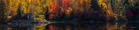 I proceeded to set the camera and tripod up on the shoulder of the road,mindful of the oncoming traffic. The lake came up to the road here so there was not much room to setup.I decided quickly to do a Pano here.There was and old building on a rock point with a door leaning on the building’s front wall.Yellow leaves highlighted by the sun  was the predominant color behind the building .Looking to the right I noticed a cottage showing through the trees.I did not want to include this cottage but saw a nice small Maple tree glowing red.That would me my right anchor.I then proceed to take four overlapping shots.I kept the shots fairly tight as to show no sky and just enough reflection to add color and detail to the composition.The water was just calm enough to create that painted effect on the colored reflections in the water.
