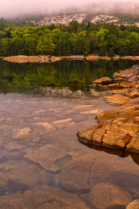 As we approached the portage in the East end of OSA Lake I noticed calm water at the Northeast corner of the lake.There was a small rock island located there.We paddled over to a small point and stepping into the water I set up my 7d Canon and tripod to capture the scene above.By using the rocks underwater and a part of the shoreline for foreground to draw your eye towards the small rock island. There was no sky but heavy mist in the background on the La Cloche Mountains.This allowed me to place the mist and mountains in the background to create more depth and mood.The white rocks also allowed for more contrast from the darker evergreens and red granite rocks.