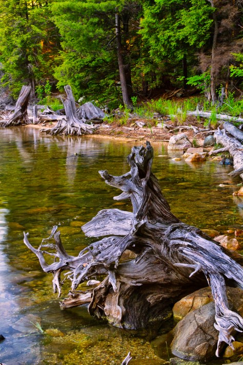 As I am out photographing I am always on the lookout for something unique.Last June while camping on Killarney Provincial Park, Paul Smith and I were canoeing along the shoreline.The lake we were on was Killarney Lake.This is a large lake with clear turquoise blue water.We spotted a group of stumps along the shoreline in a little cove.I selected this particular one where the top of the stump was in the shape of a dog’s head.I set up the tripod and Canon 7D at the waters edge.By placing the stump in the foreground and the lens at f22 for depth I captured this composition.The water is so clear here that you can see the texture of the rocks underwater.
