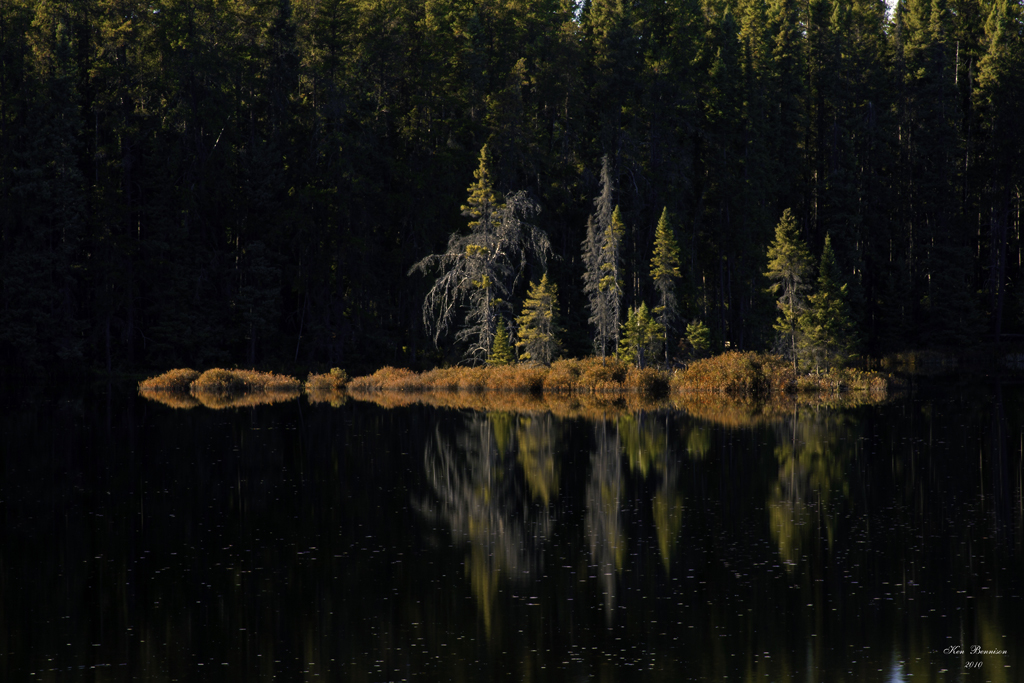 Late fall brings with it much more subdued colors as the grass and ferns turn brown and rusty red.I myself like this time of year for the challenges it offers.Jan and I were walking along a small lake when we spotted a little island across the way. There was some very interesting lighting come from the side onto the island.The evergreens had wonderful lighting filtering through to break up the dark mass in the background.This creates a background with more detail .The gray color of the dead branches give character to the trees along with the remaining tree growth being highlighted by the sun.Take in the brownish shoreline and you have a very earth tone photo. There is enough reflection in the water to create depth.