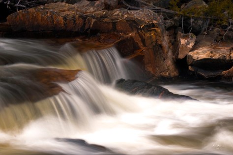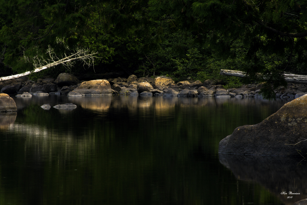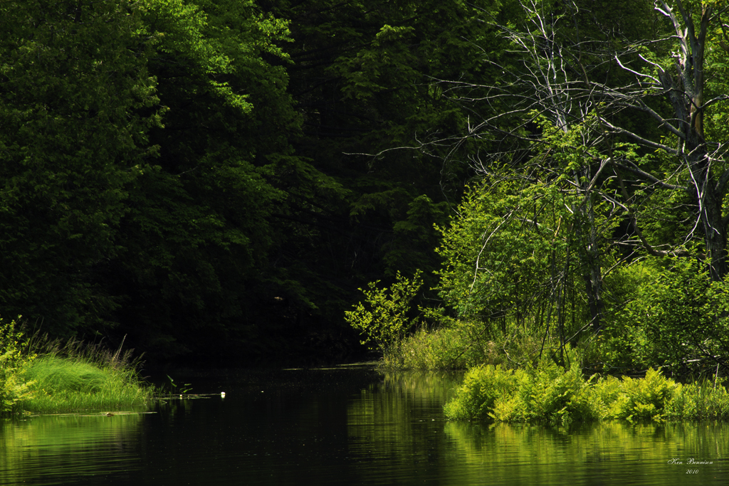 As I walked upstream I noticed a beam of sunlight highlighting the grass and ferns near the waters edge.The scene was on the opposite shore of the river.The time was getting on late afternoon and creating heavy shadows on the far shore.The sun also sets in that direction.I quickly set up and shot the scene that you see above.The dark background brings out the foreground and the reflections in the water.The dark background also helps eliminate clutter.It also helps to keep the shot tightly composed.