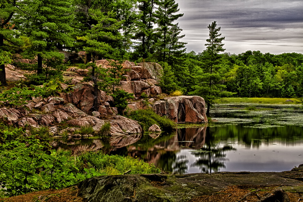 By early evening I was heading back into the Cranberry Bog.I went in by campsite 103.Upon arrival at the bridge I set up to take the above photo.There was heavy cloud cover moving in and the wind as not letting up yet.As I waited lily pads started moving in front of me.There was something moving underwater.I was able to follow its movement by watching the disturbed lily pads.Then in a small opening among the pads I made out the form of a turtle.I could just make out the moving feet.You never know what you will see.Around 8:00 pm I had a window of about 20 minutes to work with.With that said I set up and composed the above photo.The bridge is to my left out of sight.As you come up to the bog there is a rise of rock which I used for may foreground.Some of the beaver dam is seen on the left.This is a very nice rock structure here.It had caught my eye when I was first here.The wind was soon causing problems and it was time to head home.