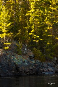 Early evening lighting filtering through the trees and side lighting the evergreens atop a cliff was the subject of this composition.Using the rocks as a base and the water in the foreground I was able to complete this photo.Shot with a zoom lense set at 100 mm and a shutter speed of 25 sec and f 5.6.