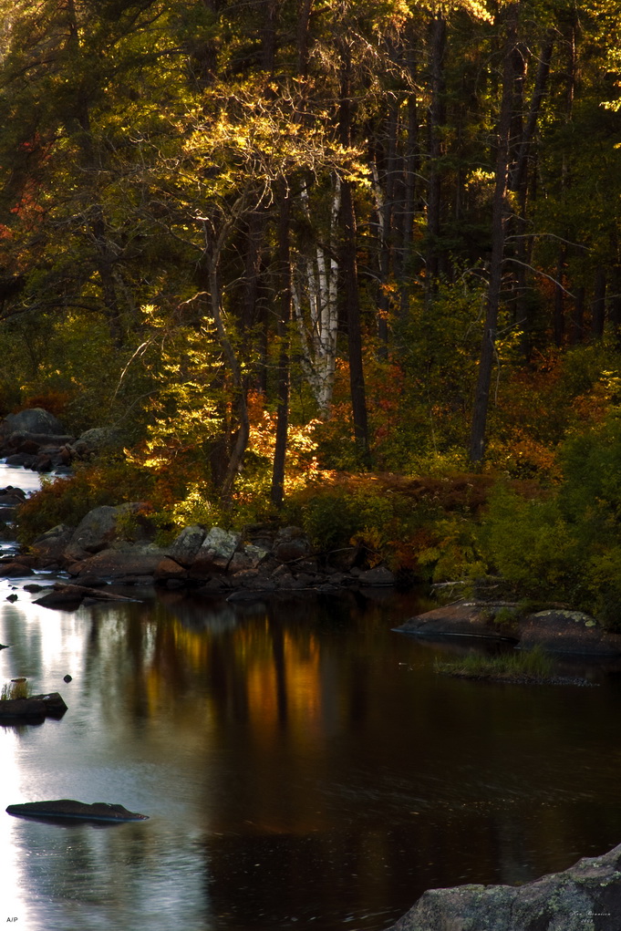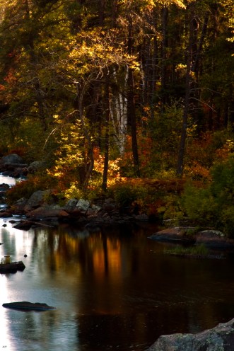 Every once in a while as you go about doing your photographing you look up and catch a scene that is made in heaven. Realizing that you only have moments to capture it you grab your equipment and rush to set up. You appraise the scene for a proper composition and set up the tripod and camera. I had to get as close as I could to get an effective composition. The whole scene lasted about 2 minutes so time was important. The sun was below the treeline and receding very quickly. There was enough fall color to add the extra touch to the photo and the lighting had reached its maximum point as it was starting to recede. There was a bit of reflection in the water to add depth and I found a rock to add to the foreground for added depth.