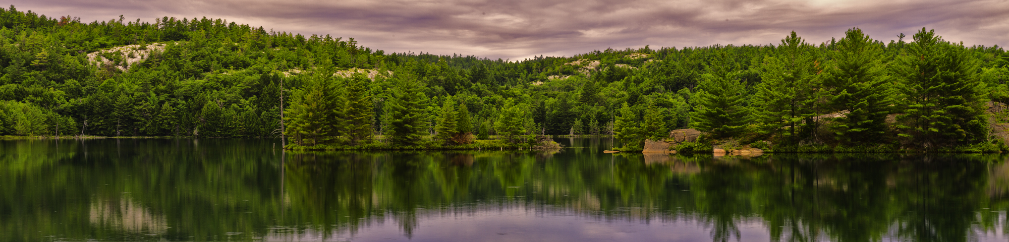 We noticed a rock outcrop in a small bay and headed in that direction.I fell in love with the parallel lines the rocks made into the water and if you count you will find there are eight points projecting into the bay.I set up my camera and tripod to capture the angle that you see and I also photo tight.I did not want to show broad leaf trees as they are still bare at this time.The wind was very light so it was a matter of waiting for a calm moment to capture some reflection in the water.I probably spent an hour and a half in this set up as the lighting kept changing.I shot the above photo with a zoom setting of 70 mm, the shutter speed set to 1/6 sec @ f22,I was able to capture this pleasing composition.