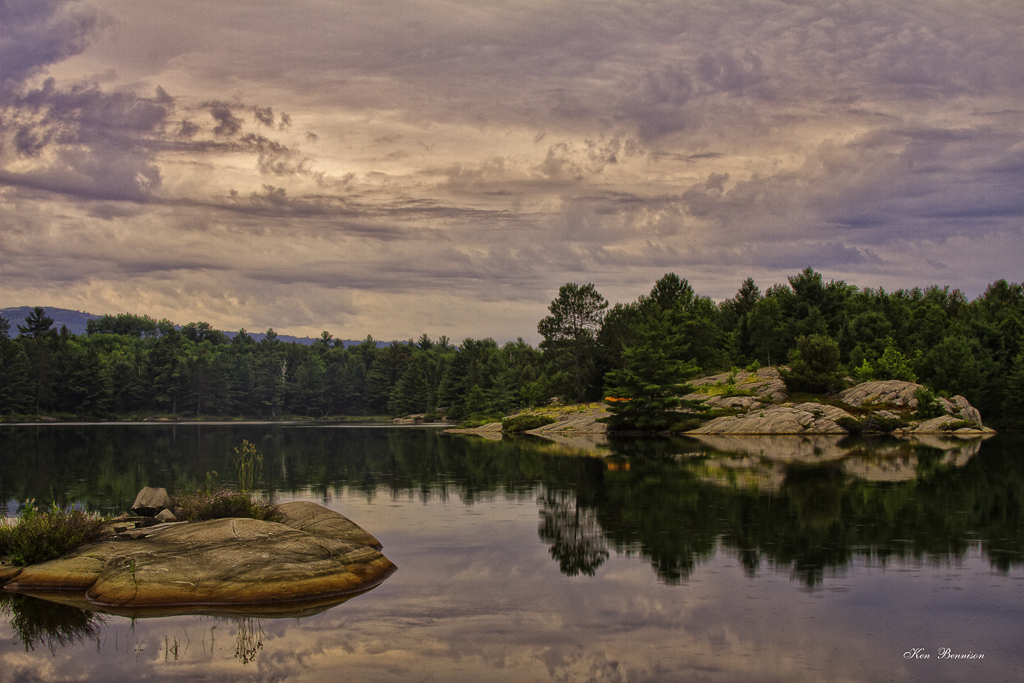 As I scanned the far shoreline I noticed this beautiful rock reflecting into the water.But what really caught my eye was the clump of birches also reflecting into the water.I put the two elements together in this photo by adjusting the position of the camera and tripod  and came up with this composition.Unfortunately there is a dock in front of the rock,but I can live with it.