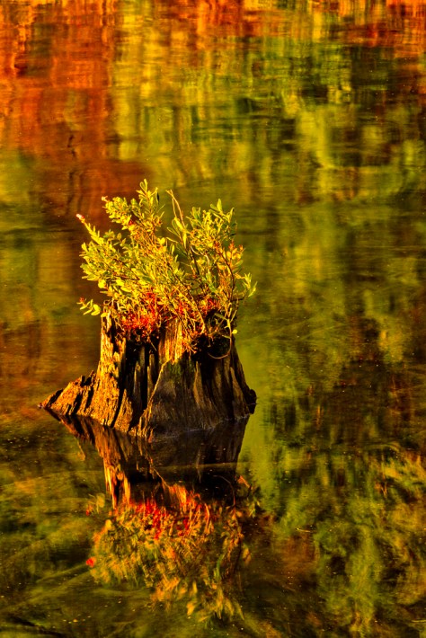 sun was providing the right amount of lighting.The stump had beautiful abstract colors around it in a slight ripple effect.I placed the stump with its vegetation growth closer to the bottom edge of the photo.I liked the effect the red flowers added to the photo.These type of shots do not come often but when I find them I will wait for the right conditions and set up