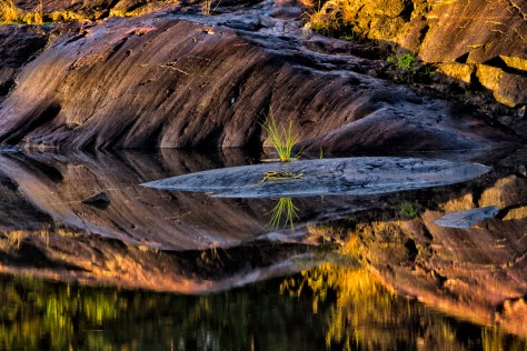 The three of us picked up the trail and started walking through a maple and birch grove of brightly colored leaves.Along the way I noticed a pond on our left.We made our way down to the pond.The wind was calm and being cloudy the lighting was very good.The first thing I saw was the small cliff face at the end of the pond.The rocks here are white quartzite that gleam.I set up the tripod and composed a shot by adding a small rock and a piece of wood reflecting in the water on the right.You will also notice evergreens on the right.I now had a lead in to the rock.There were a lot of bare trees now with no leaves so I kept the left side tight. The splash of orange and red on the cliff really brought out the picture.