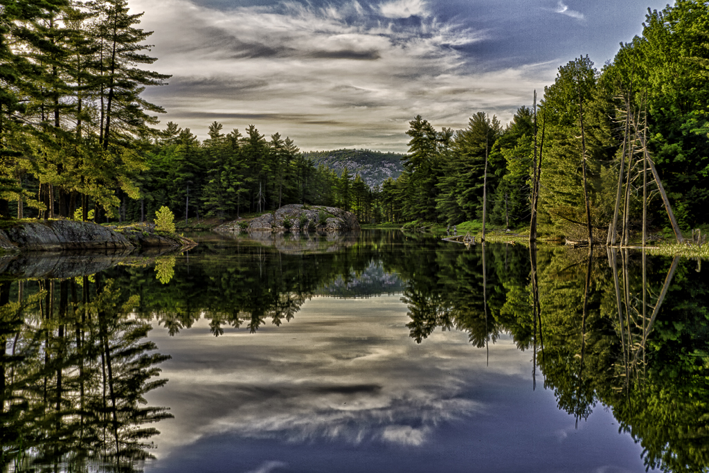 As I am out photographing I am always on the lookout for something unique.Last June while camping on Killarney Provincial Park, Paul Smith and I were canoeing along the shoreline.The lake we were on was Killarney Lake.This is a large lake with clear turquoise blue water.We spotted a group of stumps along the shoreline in a little cove.I selected this particular one where the top of the stump was in the shape of a dog’s head.I set up the tripod and Canon 7D at the waters edge.By placing the stump in the foreground and the lens at f22 for depth I captured this composition.The water is so clear here that you can see the texture of the rocks underwater.