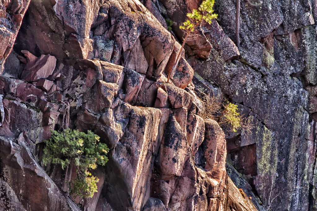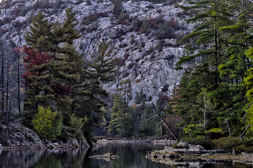 Monday evening the winds started to calm down.Paul and I stayed on the island that evening to do our photographing.This is a good campsite to work from, for the variety of angles one can work with.Some areas of the lake the wind was calm while in other parts a ripple effect was left.I was able to capture the above scene by combining the La Cloche Mountains with a bit of the near shoreline.I set my Canon D7 on the tripod and shot two vertical images overlapping.This allowed for the inclusion of the near shoreline.The sky was quite interesting as well as the sky reflecting in the water.You will also get a glimpse of the lake bottom in the foreground.The colors on the mountain side was great.There is a bit of a pink hue on rounded mountain peaks.