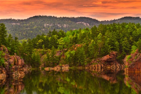 The clear turquoise blue water adds depth and mystery to the reflections on the water.It appears that the tree reflections are three dimensional when viewed.This little inlet is small in nature with the depth of the woods in the background.I composed this shot with the pink flowers in the foreground to add depth and rocks to offset the mainly green foliage.This is truly one of the pleasures of a wilderness adventure as one travels the waterways of Killarney Provincial Park