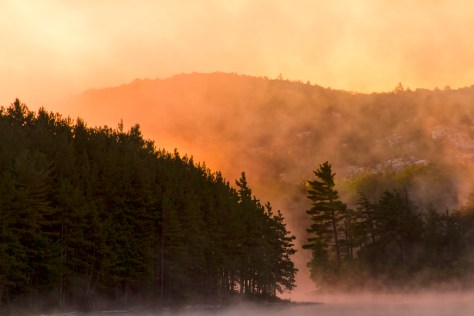 By now the light rays were peeking through the fog at the East end of Boundry Lake.The lake narrowed at this end of the lake before opening into a bay.The light rays filtered through this opening to create the effect that you see in the photo.In reality it is being in the right place at the right time.