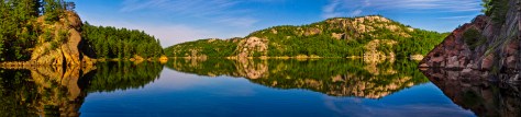 The above panoramic was taken that morning.It consists of three overlapping photos.I created depth by placing the foreground to the right and leading the eye into the depth of the lake with the placement of the island.The island was now lit by the morning sun.I set the zoom to 85 mm and the shutter speed was 2.5 sec @f22