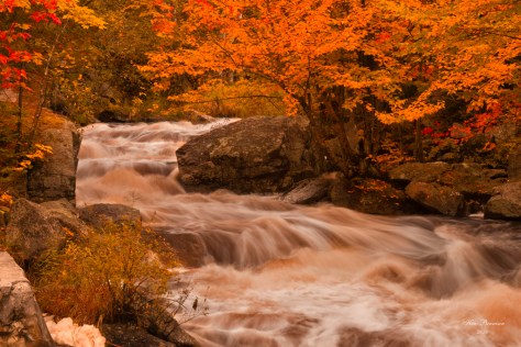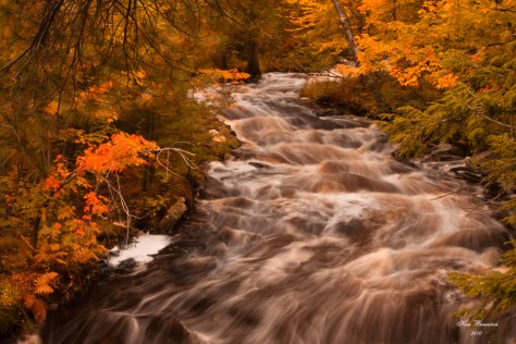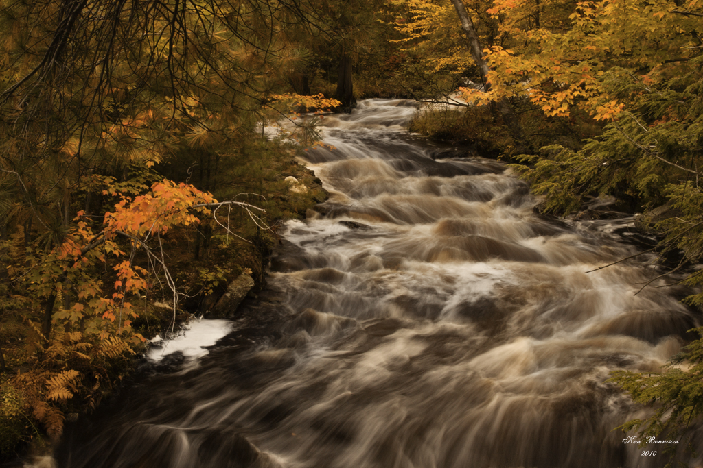 I was able to capture the above scene by creating an S-curve with the running water.The colorful leaves and evergreens added color and depth to my photo.You will notice that the water is a tea color that is common in Northern Ontario.I took this photo with a zoom setting of 41 mm.The shutter speed was set at 0.6 sec @ f29.I was able to capture a wonderful depth with this shot.Again the water flows from the top of the photo to the bottom of the photo.