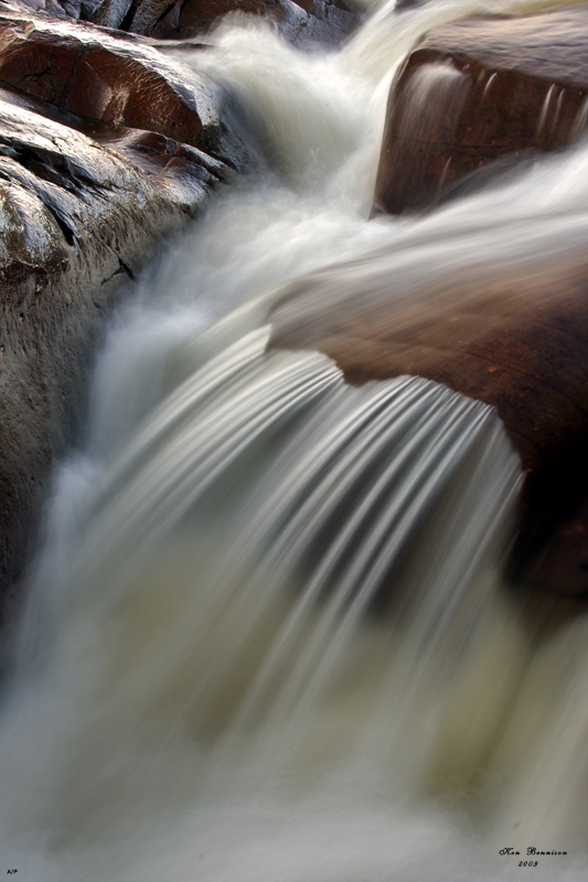 This photo was shot at a lense setting of 135mm set at 2.5 sec @ f29.I took this photo 5:30 in the evening last September.With high hills surrounding the creek and falls it tends to darken early.When photographing you should always be aware of your surroundings for that special photo opportunity.The lighting at late evening changes very quickly.