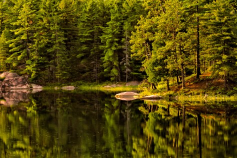 With daybreak arriving we had calm waters. The above photo was one of the many compositions I made that morning.The sun was just peering over the East horizon,casting a yellow,orange glow on some of the trees.This lake is blessed with lots of rocky shoreline to add some real character to the photos.After about an hours shooting we lost the good shooting light.It was now time to head back to camp for a good breakfast and hot coffee.