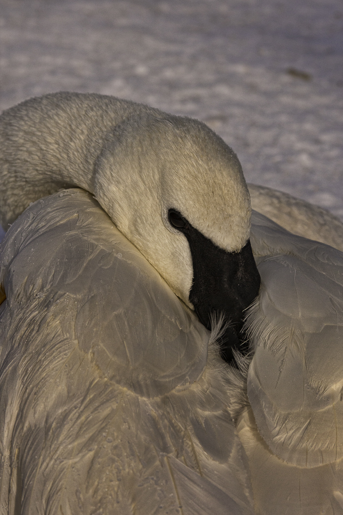 The above photo is a result of the swan coming and laying down beside.I shot this one in a horizontal format to show the curves in the swans body and the intricate detail of the feathers.You can just make out the background that tells you it is frosty and winter time.